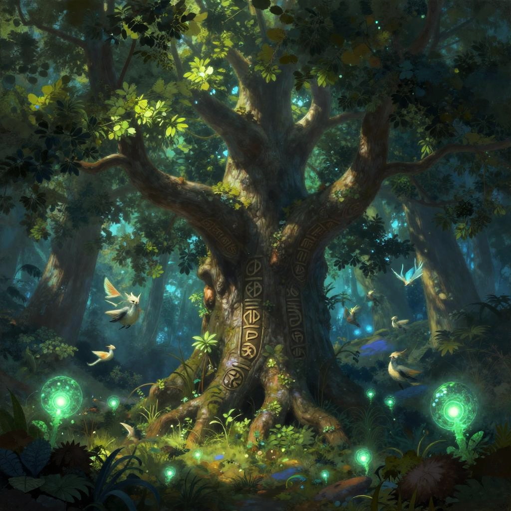 Groв§e depicted as a massive tree in a mystical forest, glowing bioluminescent plants surrounding it, ancient runes carved into the bark, magical creatures fluttering around, ethereal light filtering through dense leaves, fantasy style painting