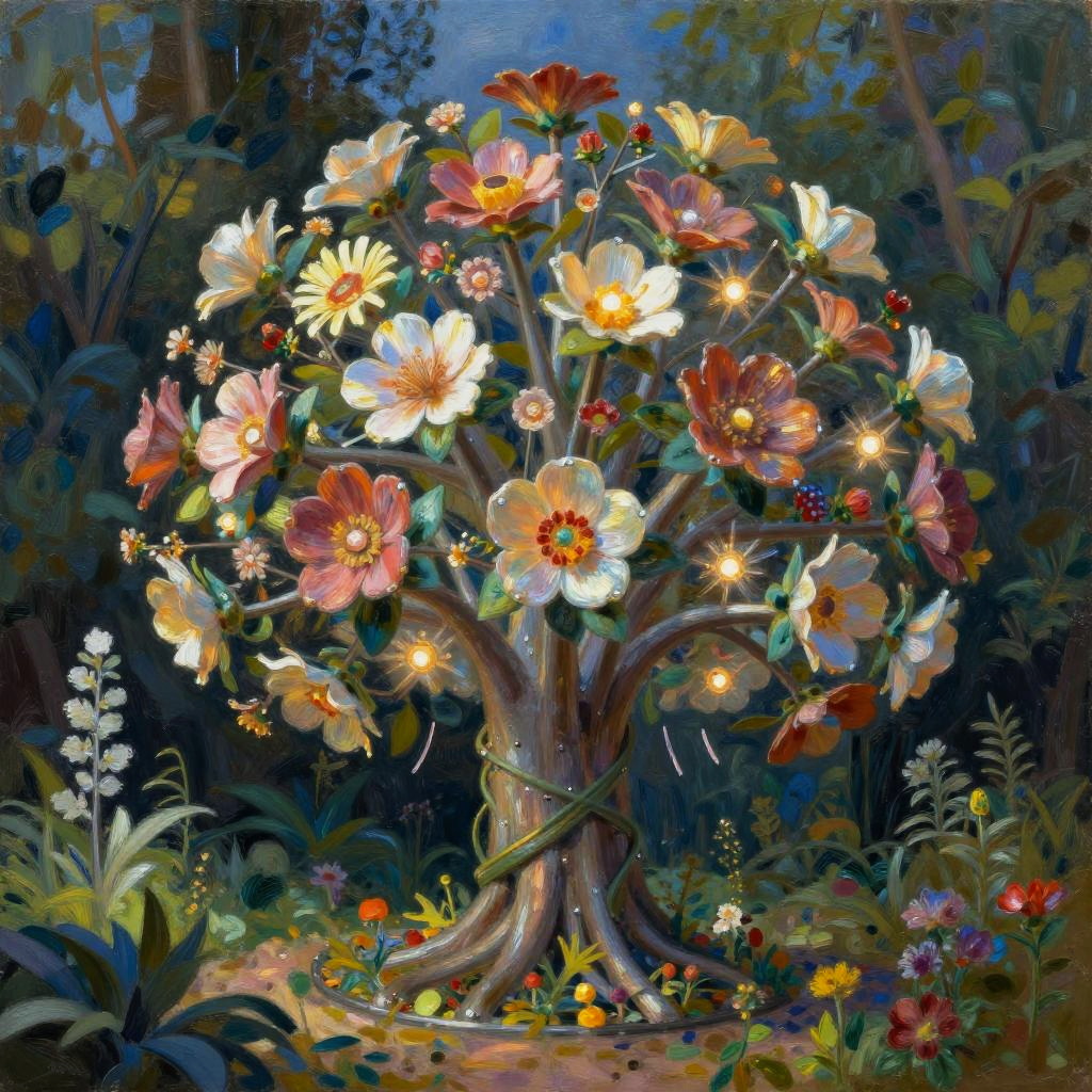 An imaginative flower generator as a large tree-shaped apparatus, flowers blooming along metallic branches radiating light, blending nature and technology with surreal ambiance, lush garden environment, impressionistic style with dynamic brushstrokes