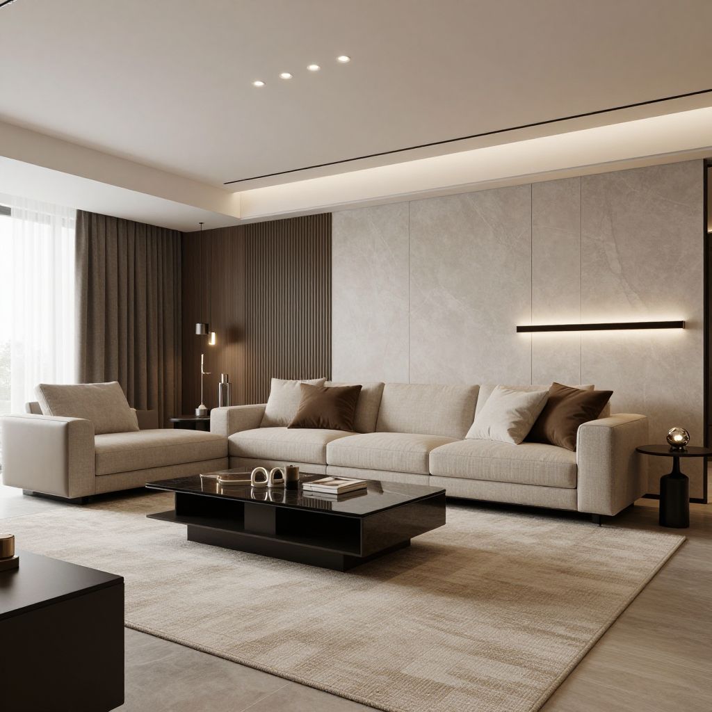Photograph of a modern living room featuring a beige sectional sofa with brown accent pillows, centered on a light beige textured rug. A black rectangular coffee table with a tray and decorative items sits in front. Dark brown curtains cover a large window to the left, and a sleek black floor lamp with dual lights stands next to the sofa. The back wall has a minimalist, light gray, textured finish with a horizontal black strip light above. The ceiling has recessed lighting, creating a soft, ambient glow. The overall style is contemporary with a neutral color palette.