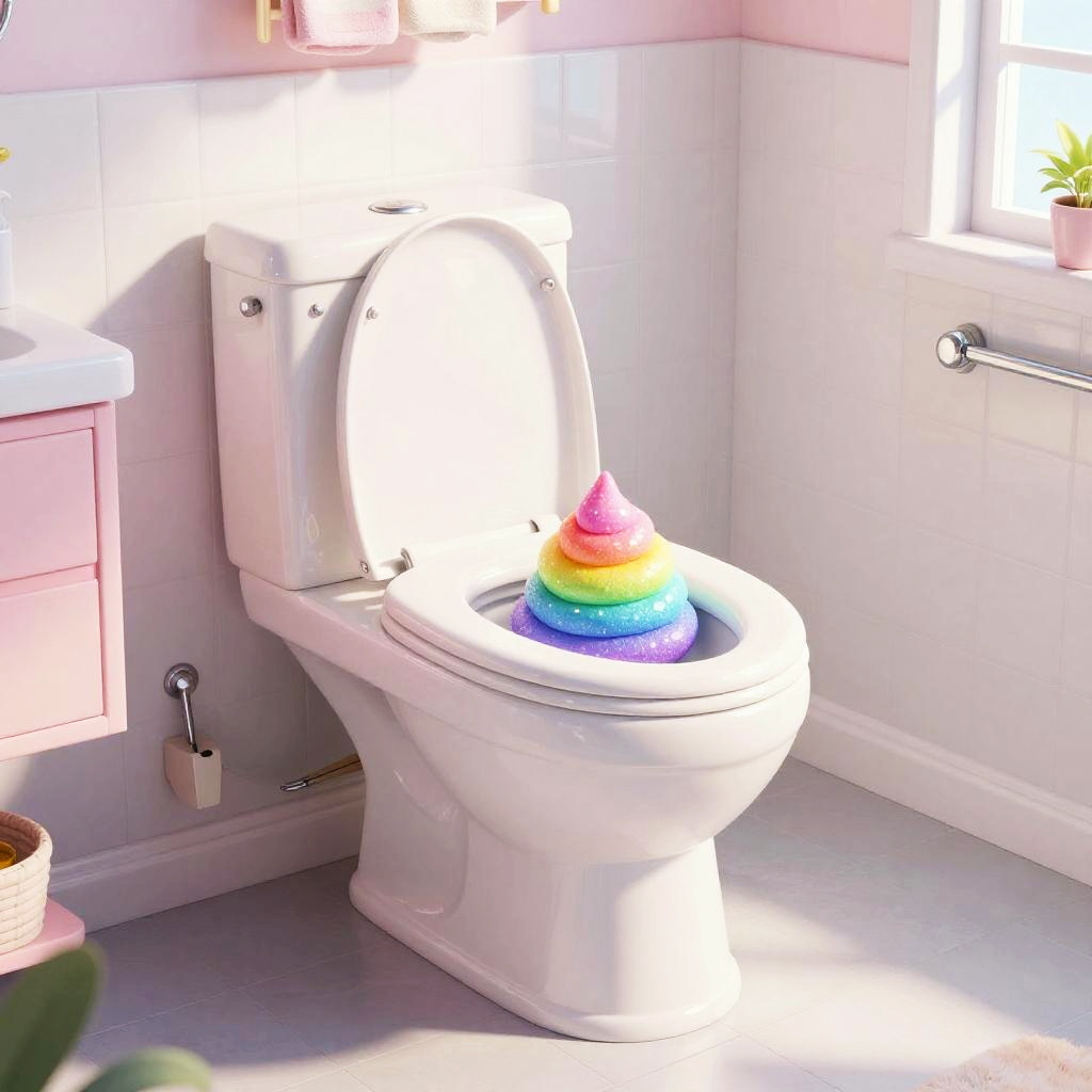 Toilet with sparkling rainbow poop inside, playful fantasy scene, pastel bathroom decor, light reflections on ceramic surfaces, cartoon-like yet detailed illustration