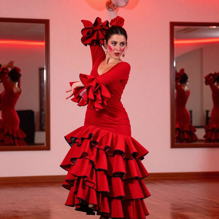 Photograph of a dark-haired woman with fair skin, wearing a vibrant red, long-sleeved, ruffled flamenco dress with black accents. She strikes a dramatic pose, arm raised with a large red bow, and gazes at the camera with bold red lipstick. The background features two large mirrors reflecting her image, set against a white wall with red lighting. The wooden floor adds a warm contrast to the vivid red of her dress. Her makeup is dramatic, with dark eyeliner and red lipstick, and she wears large, dangling earrings. The overall atmosphere is energetic and theatrical.