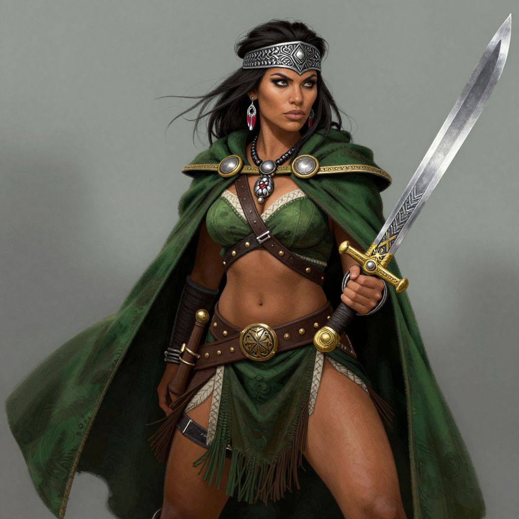 Digital art of a fierce, dark-haired warrior woman in green armor, holding a silver sword, with a confident stance.
