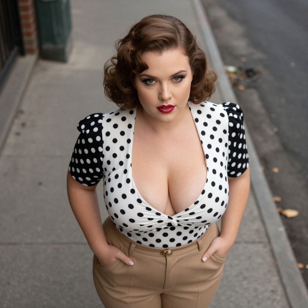 A Curvy woman in a polka dot blouse and khaki chinos, captured in an overhead shot at a 1930s New York City street scene. Sexy. Pretty face and beаutiful eyes. Big breasts