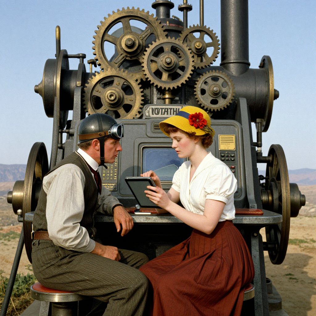 In this futuristic scene reminiscent of the early 20th century, a man and a woman sit in front of a large, intricate machine that appears to be a combination of a steam engine and a computer. The man, wearing a helmet with goggles, looks intently at the woman, who is holding a tablet-like device. The woman, dressed in a white blouse and a yellow hat adorned with a red flower, seems to be reading or interacting with the device. The machine, labeled \"VOTAITHI,\" dominates the background, with its complex gears and pipes suggesting advanced technology. The scene is set against a backdrop of a clear sky with distant mountains, creating a sense of a utopian future where technology and nature coexist. The overall composition, with its detailed textures and vibrant colors, evokes the style of Norman Rockwell, blending elements of the past with futuristic visions.