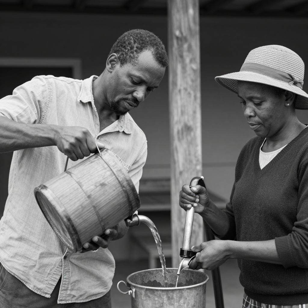 Black-and-white photograph of two African-American people. Man with short hair, light-colored shirt, focused expression, pouring from wooden bucket into metal pump. Woman with wide-brimmed hat, dark sweater, attentive expression, holding handle of pump. Pump with two spouts, wooden structure background.