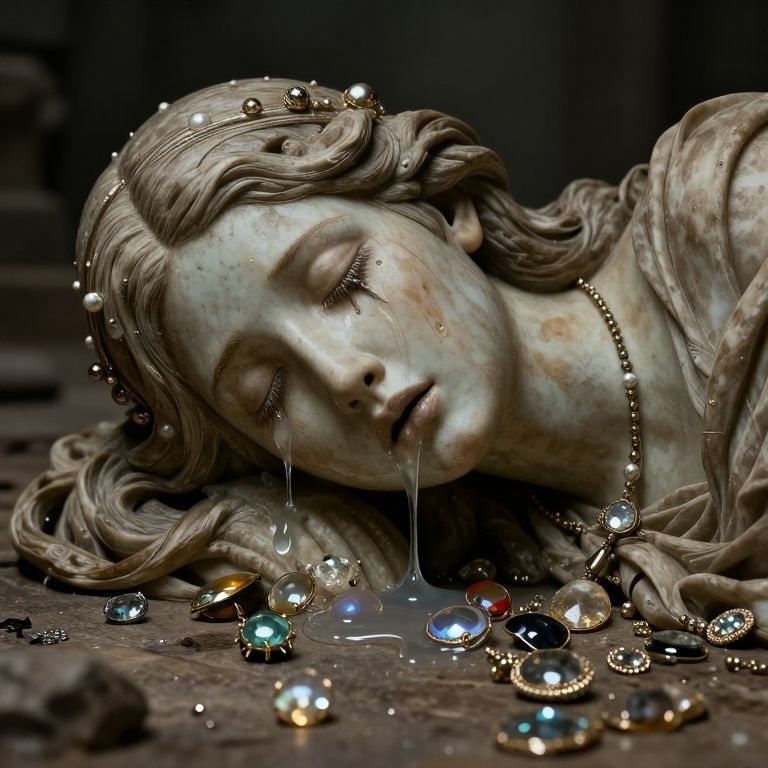 A forgotten deity weeps jewels that melt into history’s most pivotal moments, reviving them briefly where they fall.