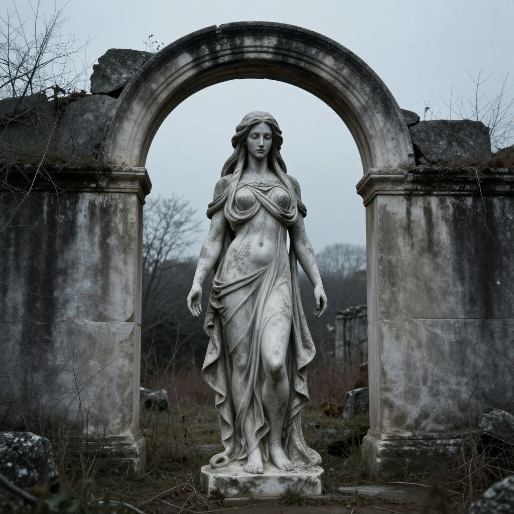 A haunting sculpture of a woman with long, flowing hair stands amidst the ruins of an ancient archway, surrounded by a desolate, overgrown landscape.
