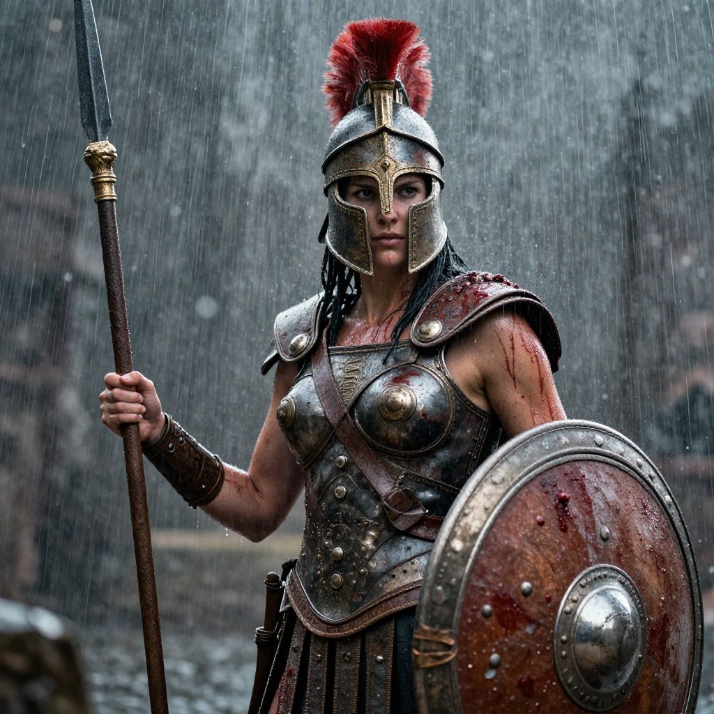Epic illustration of a Spartan hoplit woman warrior, helmet, spear, shield, wounds, blood, broken armor, standing resolute in the pouring rain, looking at the camera, close up, evoking the grandeur of Gladiator, soaked in blood, undamaged details, while rendering with dynamic lighting, sweeping camera angles, and intense emotional depth, (masterpiece), (realistic), 8k, RAW photo, very wide shot, octane render, unreal engine, volumetrics dtx, (film grain, bokeh, blurry foreground)