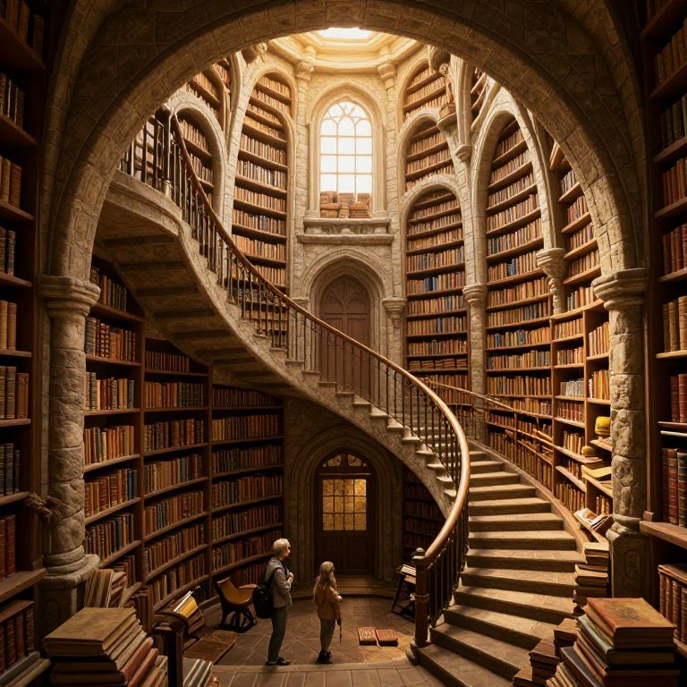An enchanting 3D-rendered fantasy library spirals upward through stone arches and endless staircases, bathed in golden-hour light, where ancient books whisper secrets to curious wanderers amidst a timeless, vintage ambiance.