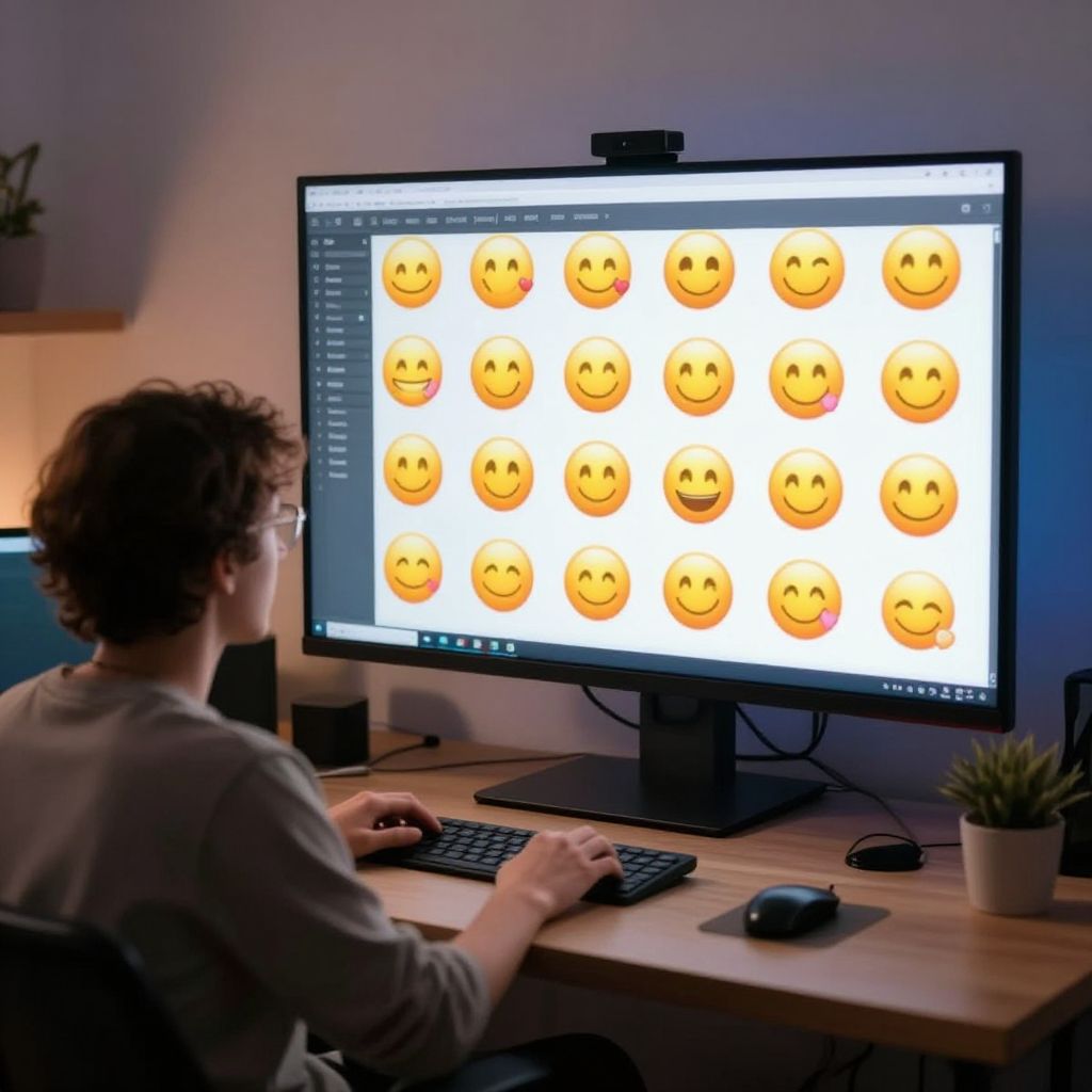 Dynamic scene of a digital artist collaborating with emoji maker AI, large touch screen displaying emoji variations, ambient soft lighting, creative studio with tech elements, emphasis on human-AI partnership in generating unique emojis