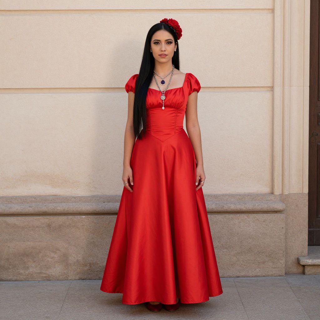 Photograph of a young woman with long, straight black hair, wearing a vibrant red, satin, off-the-shoulder, puffed-sleeve ball gown that flares out at the waist. She has a red flower in her hair and wears a silver necklace with a red pendant. She stands against a beige stone wall with a narrow, rectangular window to her right. The image has a bright, natural light, highlighting the rich color of her dress and the smooth texture of the fabric. The background is simple, focusing attention on her elegant, festive attire.