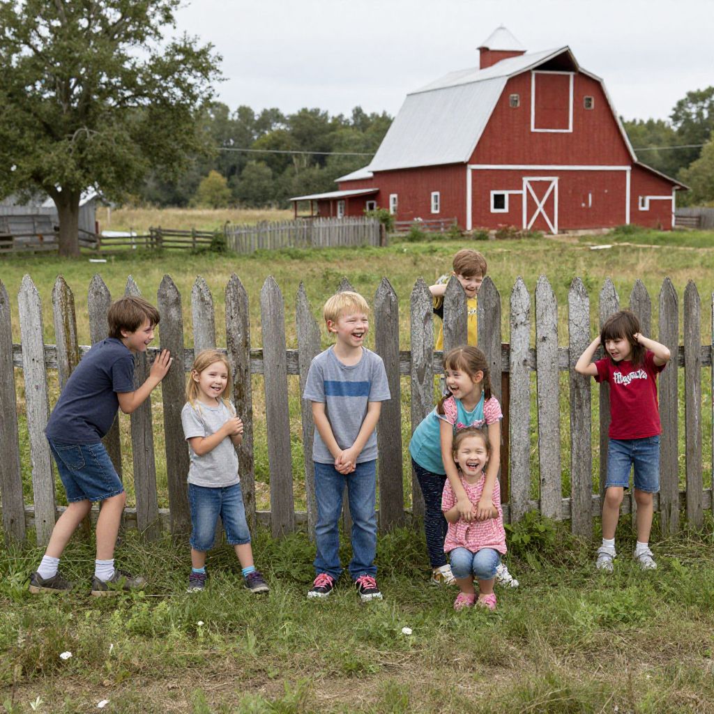 A group of children playing hide and seek in a small rural village, laughter echoing through the fields, with a weathered wooden fence and a red barn in the background, highlighting the simple joys of everyday life rural communities