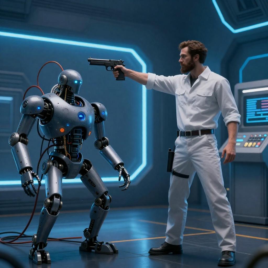 A blue-lit sci-fi scene shows a bearded man in a white shirt and pants pointing a gun at a tangled, robotic creature with numerous cables. Neon blue lines illuminate the background, and a control panel is on the right. The man stands to the right, while the creature is on the left.