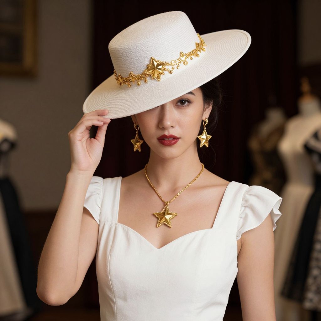 Star Costume Theatrical Supply, woman in a white dress and a hat with gold jewelry