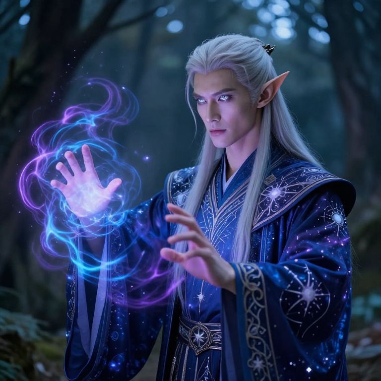 Male elf art showing a mystical mage casting a spell, hands emanating swirling blue and purple magical energy, robes decorated with celestial patterns, tall and slender with high cheekbones and bright silver eyes, atmospheric and moody lighting in a twilight forest setting.