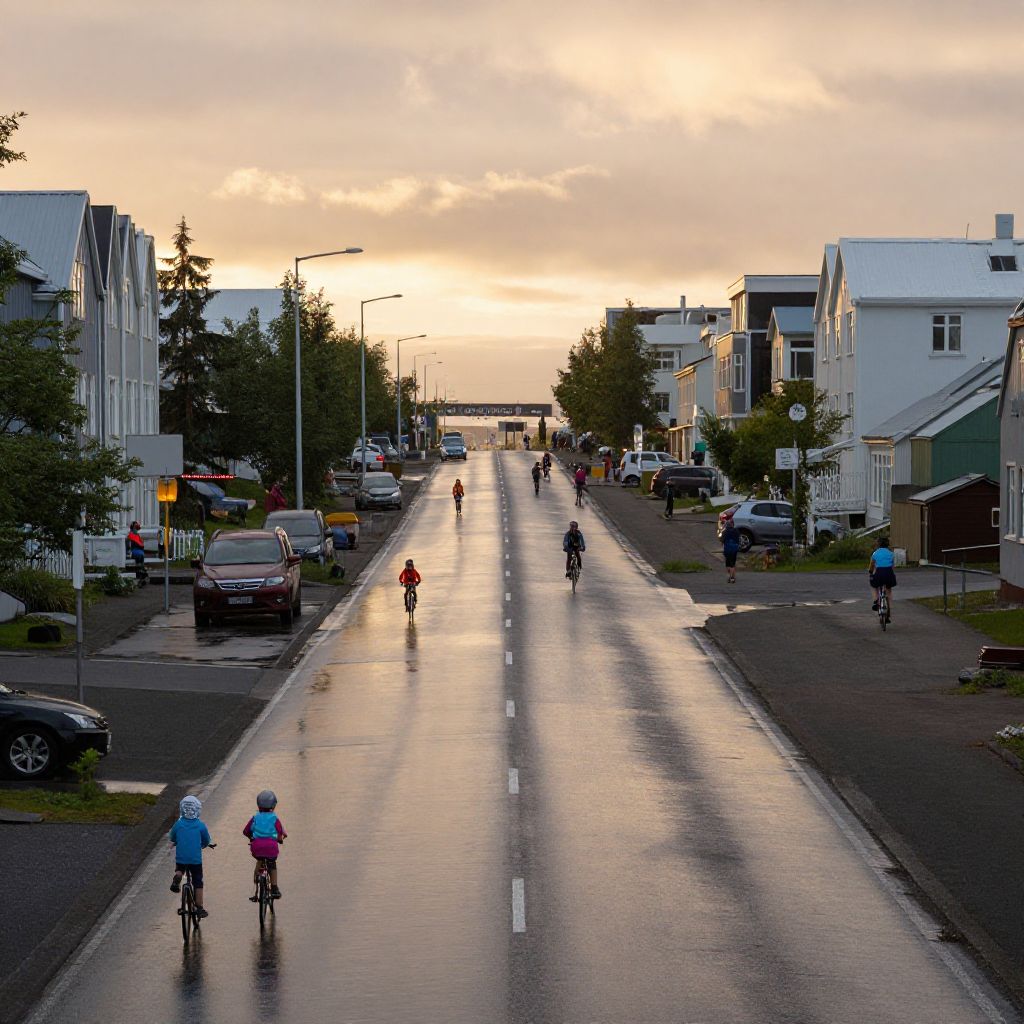 Mournful a four lane highway downtown iceland with no cars but children playing and lots of people cycling. After rain, Golden hour,
