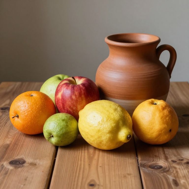 Tempra-inspired still life featuring fresh fruits and rustic pottery on a wooden table, vivid colors with a smooth matte finish, subtle shading and layering, highlighting the natural beauty and calm simplicity of everyday objects in classic art.