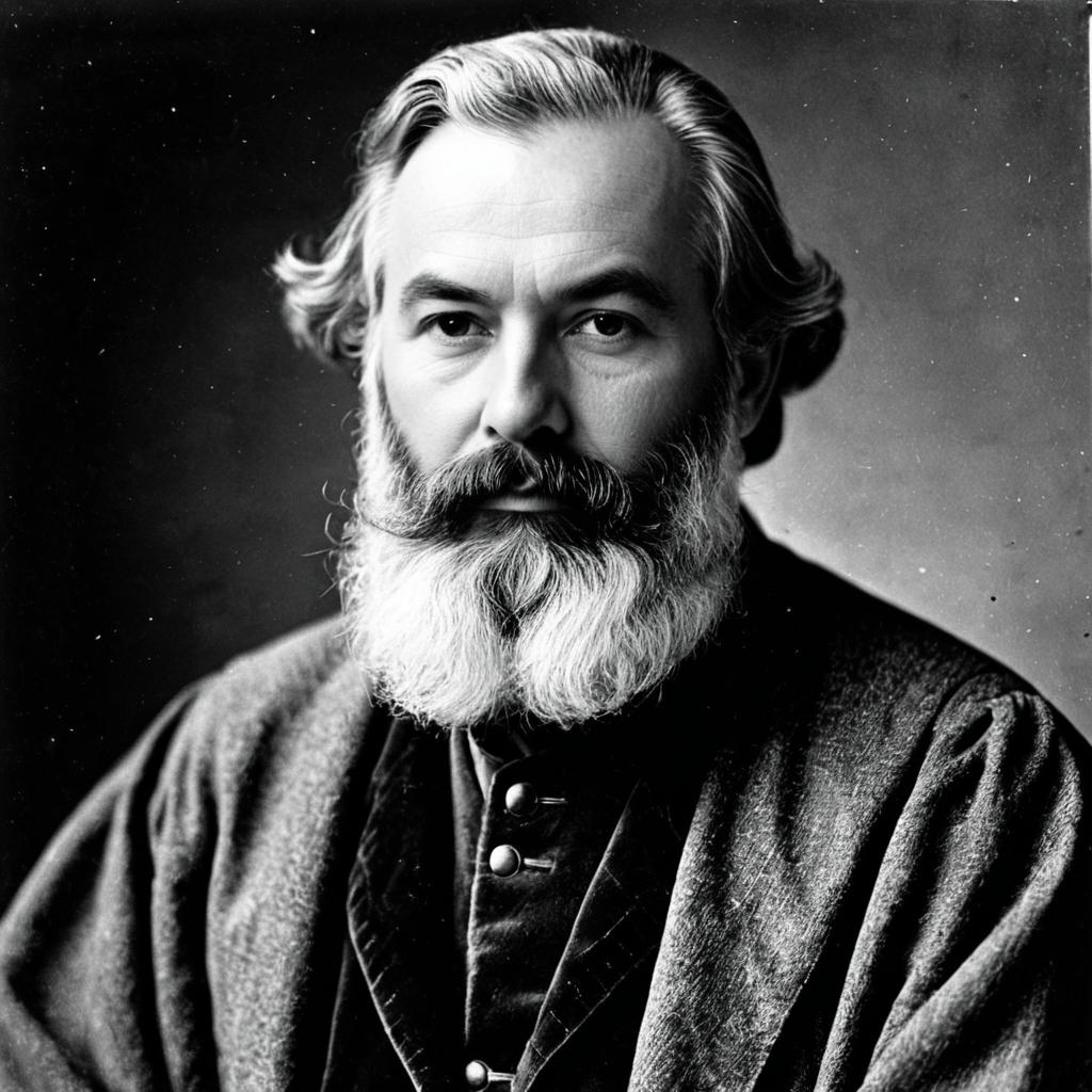 Black and white portrait of an elderly man with thick white beard and mustache wearing a dark textured long-sleeve garment. The man has a solemn expression and looks directly at the viewer. The lighting highlights facial details and hair texture on a neutral background.