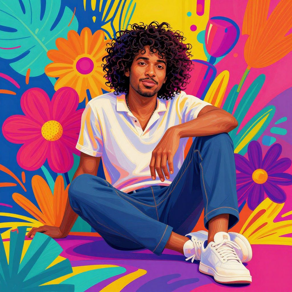 A vibrant digital illustration features a young Black man with curly black hair and a goatee, sitting against a colorful, psychedelic background filled with large, bright flowers in pink, orange, blue, and yellow. He wears a white polo shirt, blue cuffed jeans, and white sneakers. His right arm rests on his knee, and his left hand touches the ground. The background and his outfit contrast sharply, creating a striking visual effect. The image exudes a playful, retro vibe reminiscent of 1970s pop art.