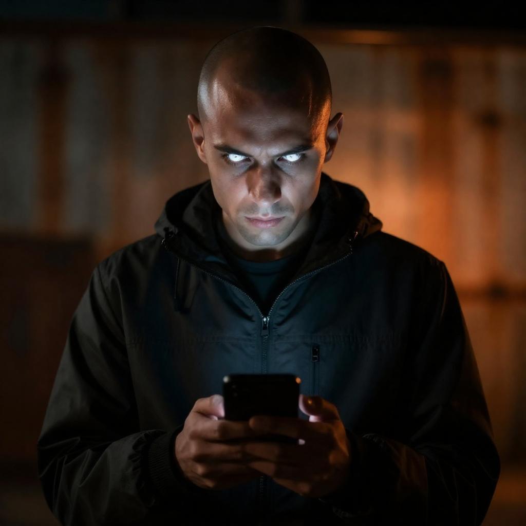 Photograph of two men. Foreground man, blurry, brown and black shirt, holding object. Background man, clear, dark shirt, standing by broken window, autumn trees outside. Intense expressions. Rusty window frame. Daylight. Two people.