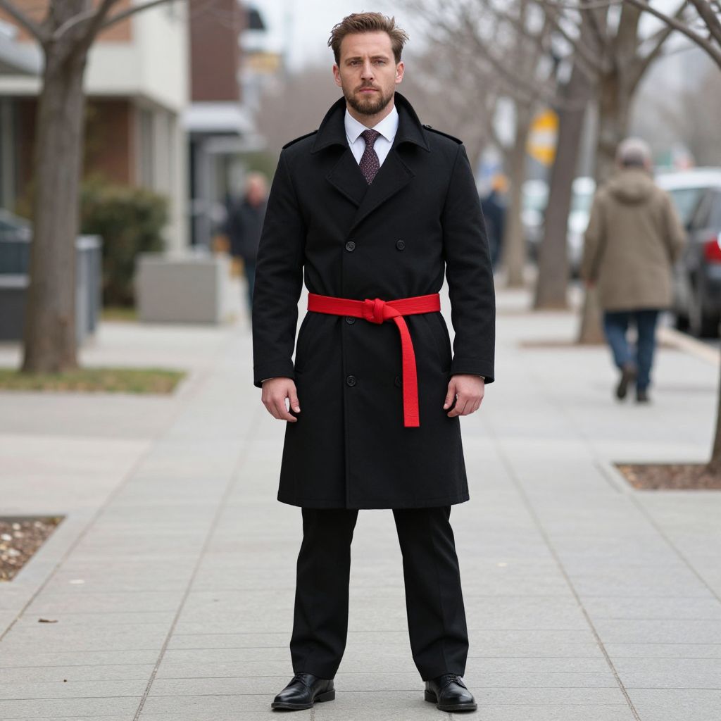 Screen Accurate Costume, man in a black coat and red belt standing on a sidewalk
