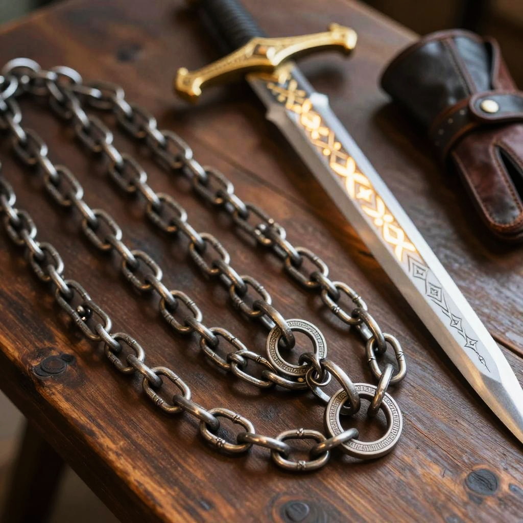Dnd chain armor detailed close-up, shimmering steel rings forged with magical engravings, resting on a wooden table beside a glowing enchanted sword and leather gauntlets
