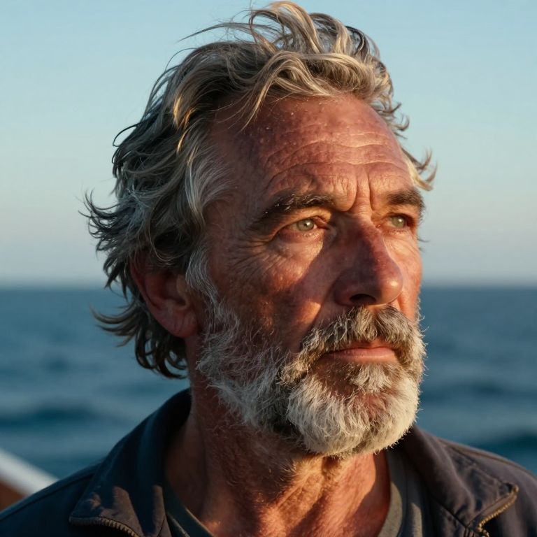Photograph of a middle-aged man with weathered, sun-kissed skin, and a rugged, salt-and-pepper beard and hair. His piercing blue eyes gaze thoughtfully into the distance. He wears a dark, slightly worn jacket over a gray shirt. The background is a blurred, serene ocean under a clear, blue sky at sunset, with warm, golden light casting soft shadows on his face. His expression is contemplative, and his skin texture shows signs of age and experience. The image has a natural, realistic style, capturing the man's earthy, maritime aesthetic.
