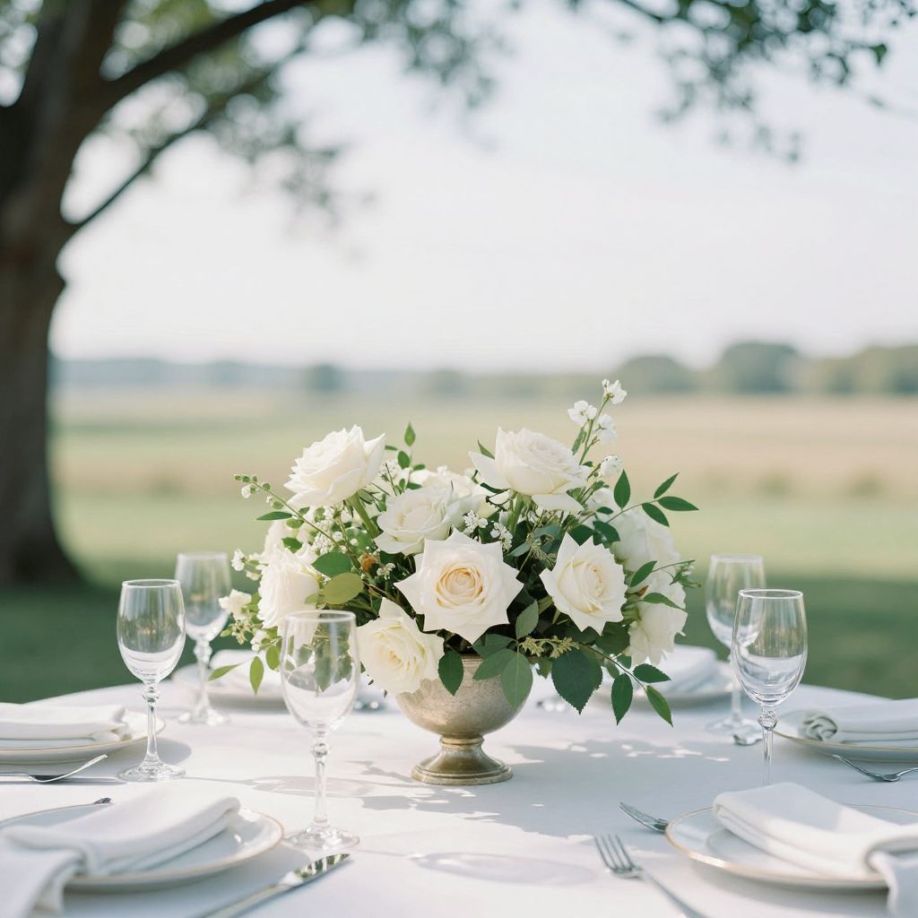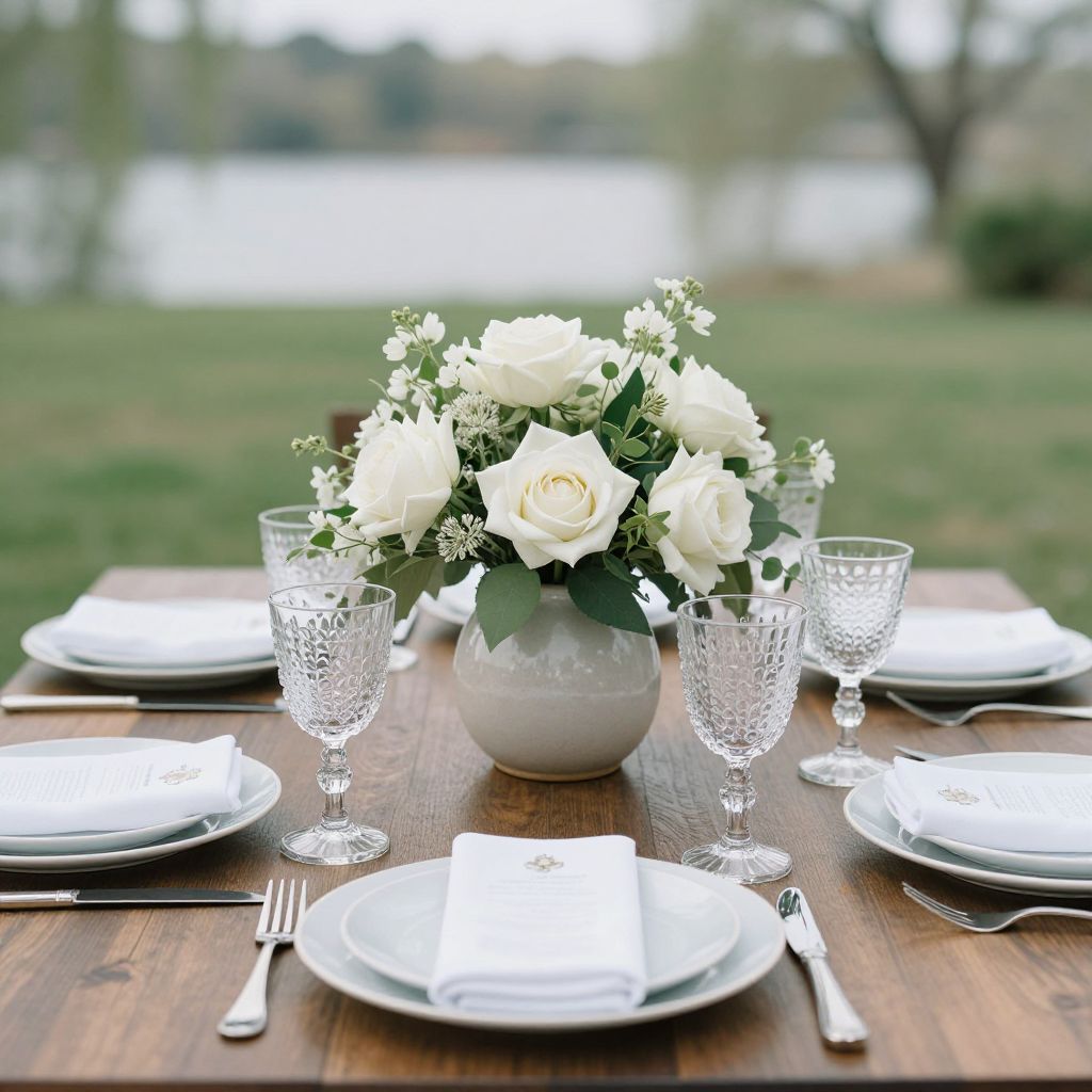 Elegant wooden table set for an intimate outdoor wedding in autumn featuring silver candelabras with tall white candles, low greenery centerpieces with white flowers, and neatly arranged place settings with layered plates, textured glassware, and white folded napkins.