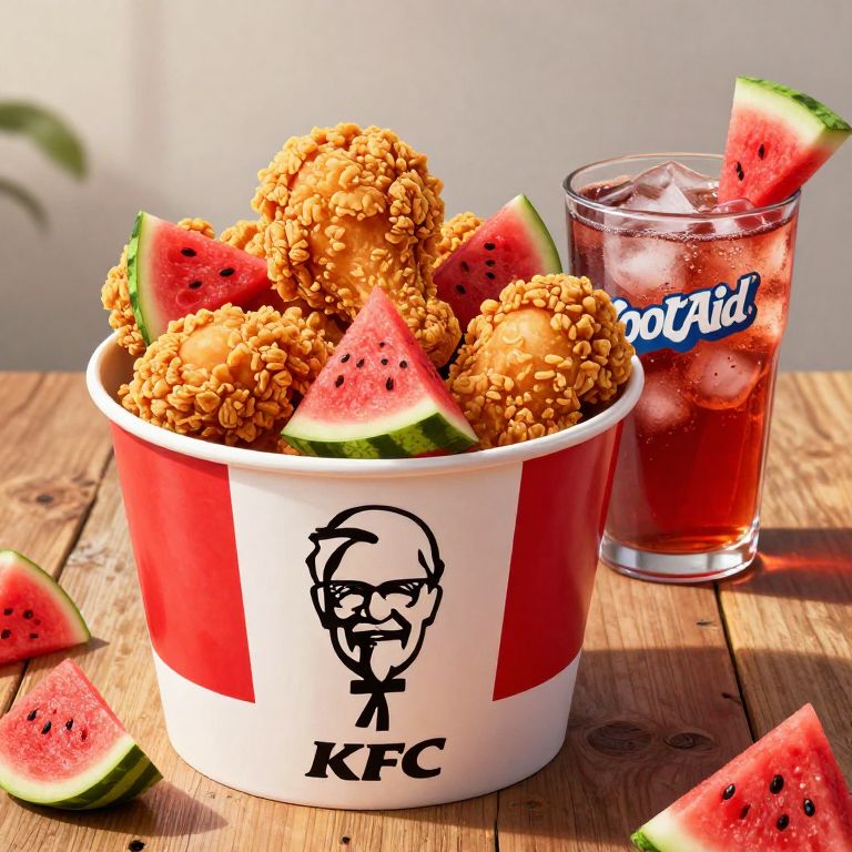 KFC Kool Aid Watermelon fusion food art featuring a stylized bucket of crispy fried chicken infused with watermelon patterns, a glass of Kool Aid with watermelon garnish, set on a rustic wooden table under bright sunlight, hyper-detailed digital painting.