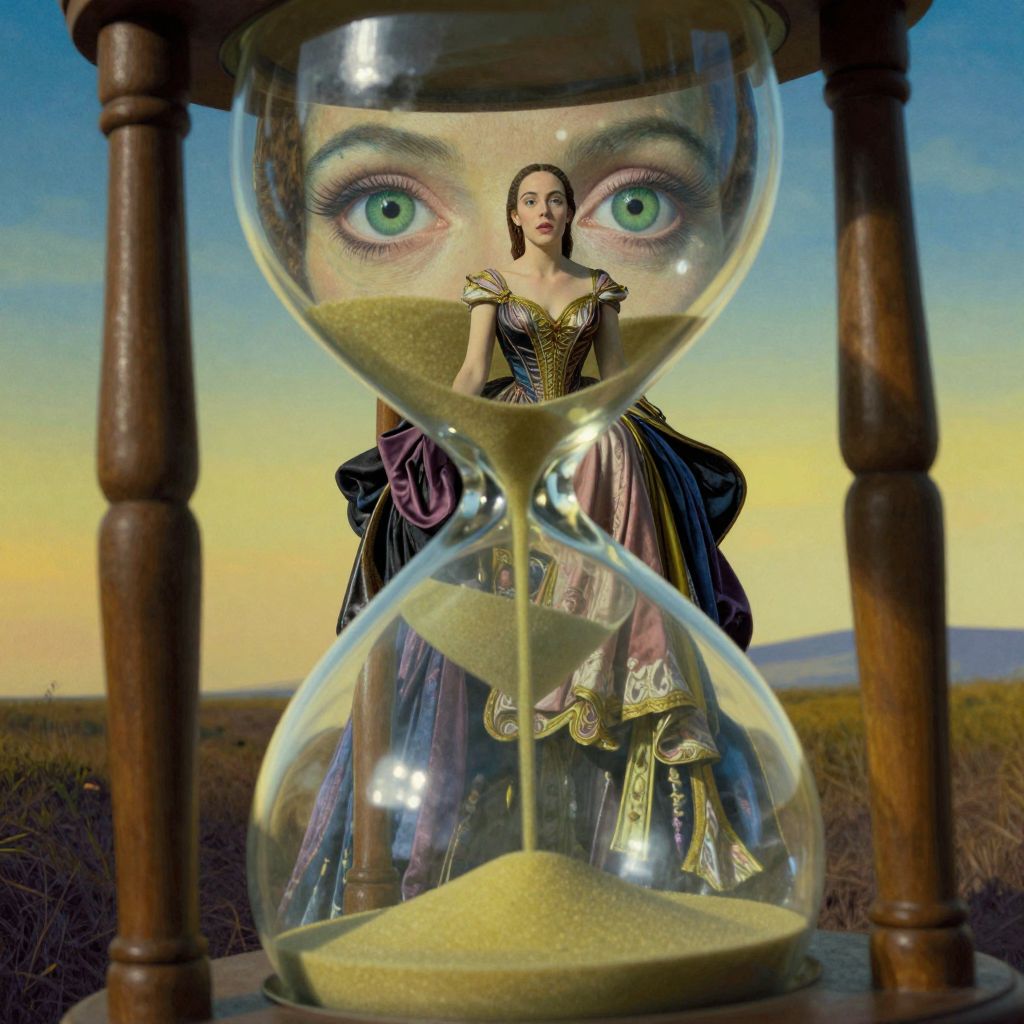 A digital artwork depicts a beautiful woman with green eyes and a fair complexion, dressed in an elaborate, gold-embroidered, purple and black gown, trapped inside a glass hourglass. Her large, reflective eyes dominate the upper half of the hourglass, while her elegant dress fills the lower half. The hourglass sits on a wooden stand with a sunset sky and barren landscape in the background. Sand is visibly trickling through the center, emphasizing the passage of time. The image combines realism with a surreal, fantasy style, creating a striking, ethereal effect.