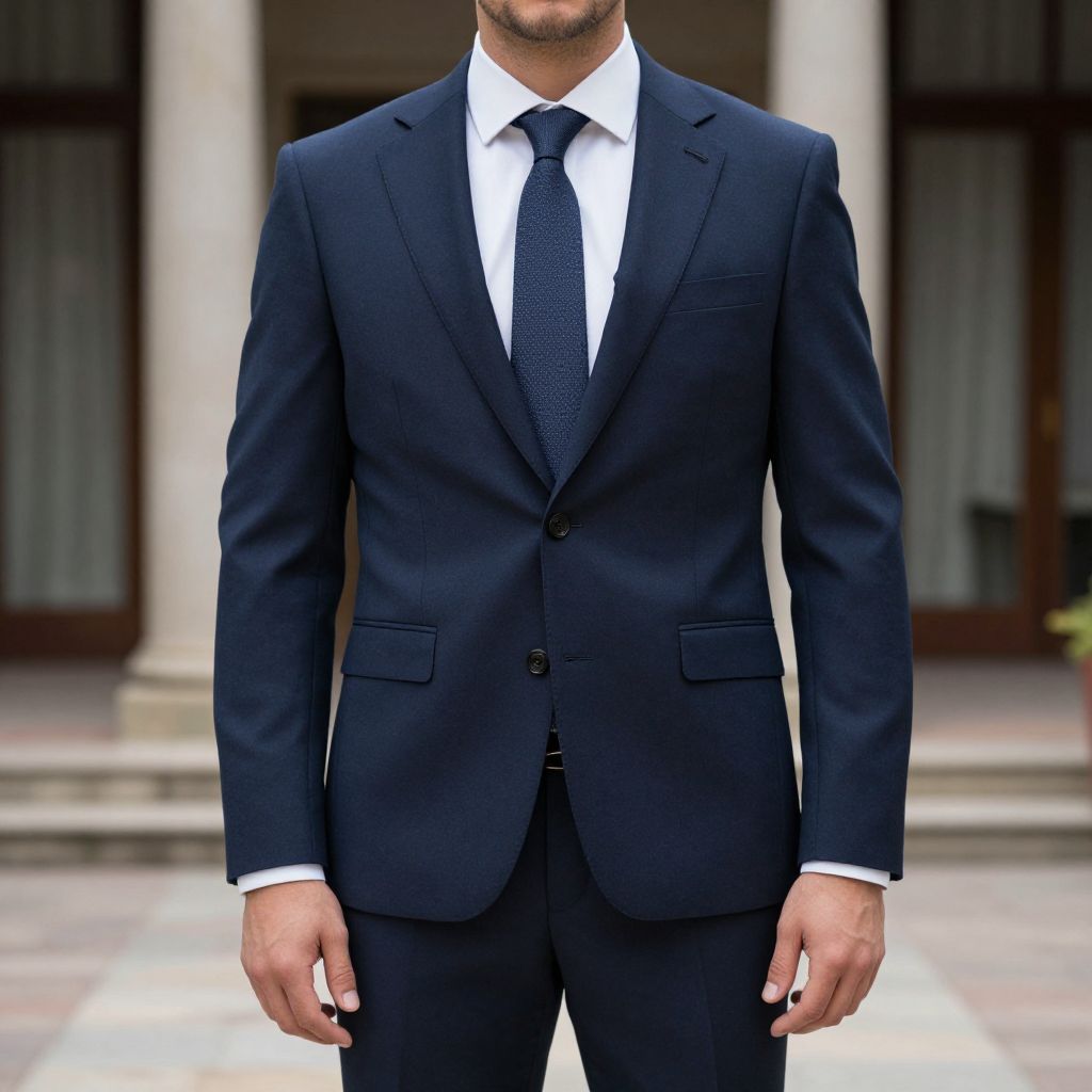 Smart Casual Male Costume, man in a suit and tie standing in a courtyard