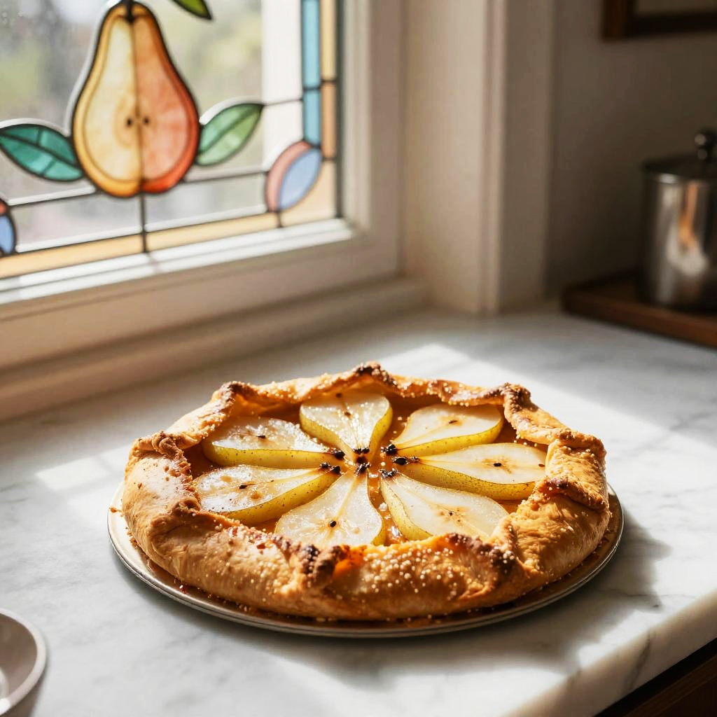 A pear galette placed on a marble countertop. The scene features a sun-dappled mullioned window that allows sunlight to pour in, creating a warm atmosphere in a cozy Swiss bakery. Captured with a camera at ISO 400, shutter speed 1/125, focusing on the intricate details and vibrant colors.