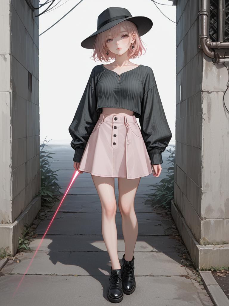 1girl, realistic face, full body shot, Woman, contemporary casual, charcoal grey ribbed crop top, long sleeves, round neckline, pale pink A-line mini skirt with laser-cut hem, black wide-brimmed felt hat, white background