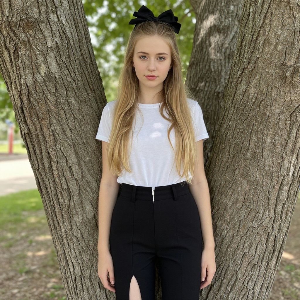Photograph of a young blonde woman with long hair, black bow, white t-shirt, and black pants, standing against tree bark in a sunlit