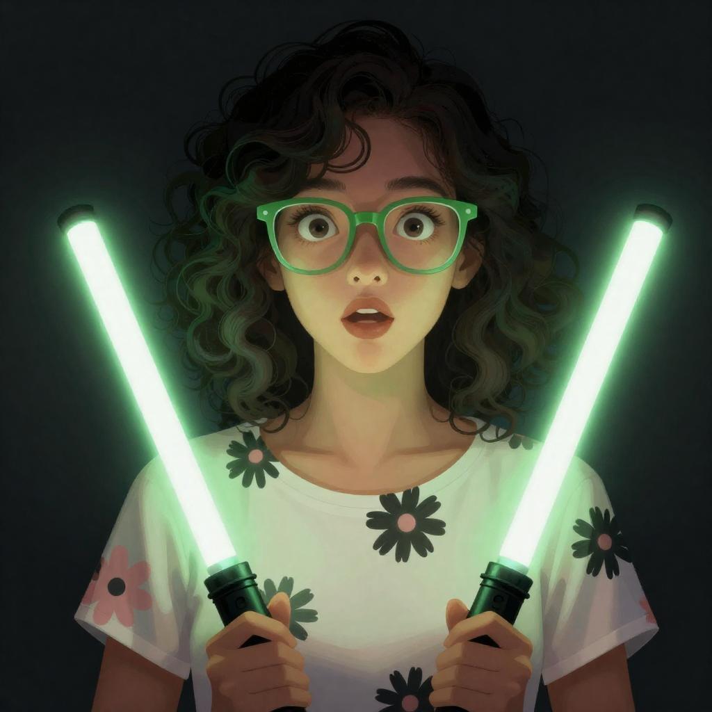 A digital illustration of a young woman with curly dark hair and large green glasses, holding two glowing green neon lights. She wears a white blouse with black floral patterns and pink flowers on the sleeves. Her wide-eyed expression shows surprise. The dark background contrasts with the bright neon lights.