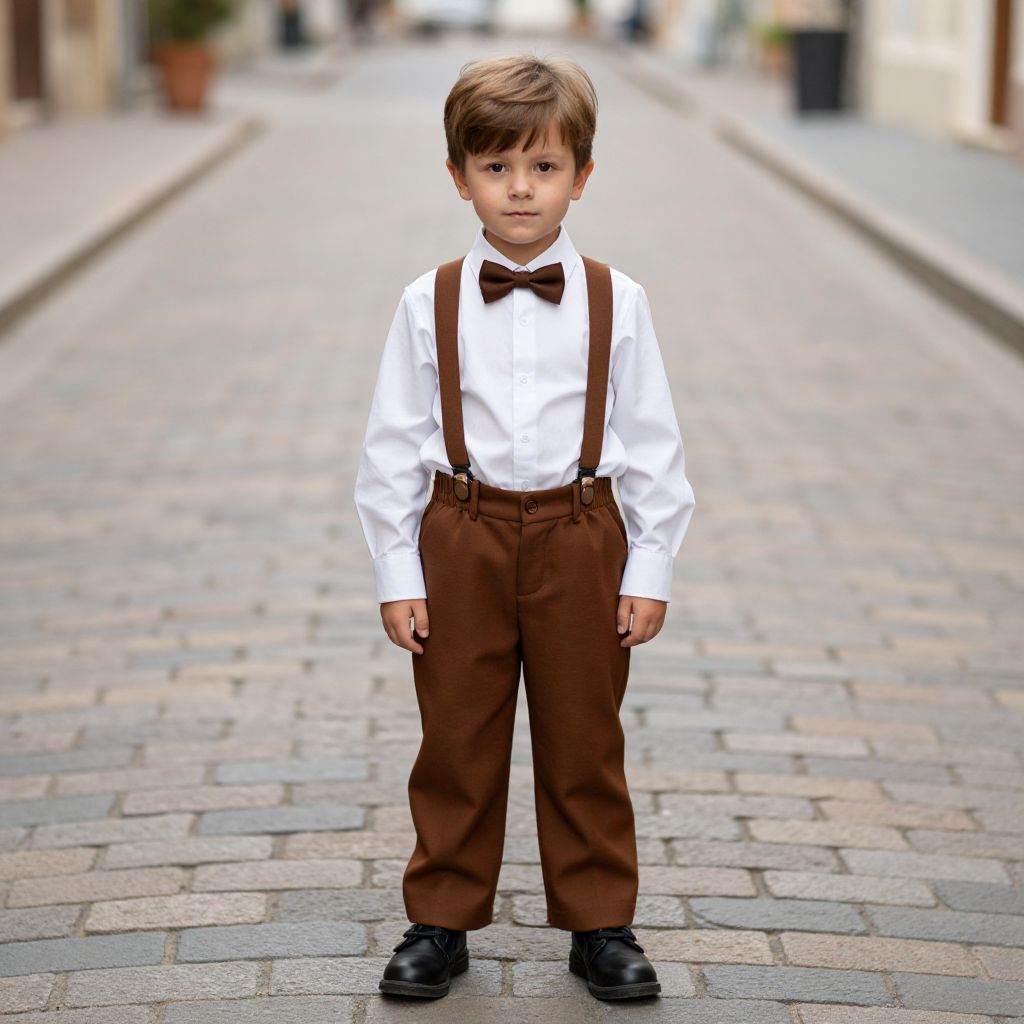 Photograph of a young Caucasian boy with light brown hair standing on a cobblestone street. He wears a white dress shirt, brown bow tie, and brown suspenders with matching brown trousers. His black shoes are polished. The boy's expression is neutral, and he looks directly at the camera. The background shows an out-of-focus, narrow street with blurred buildings and potted plants on either side, giving a quaint, European village feel. The lighting is natural, and the image has a slightly soft, dreamy quality.