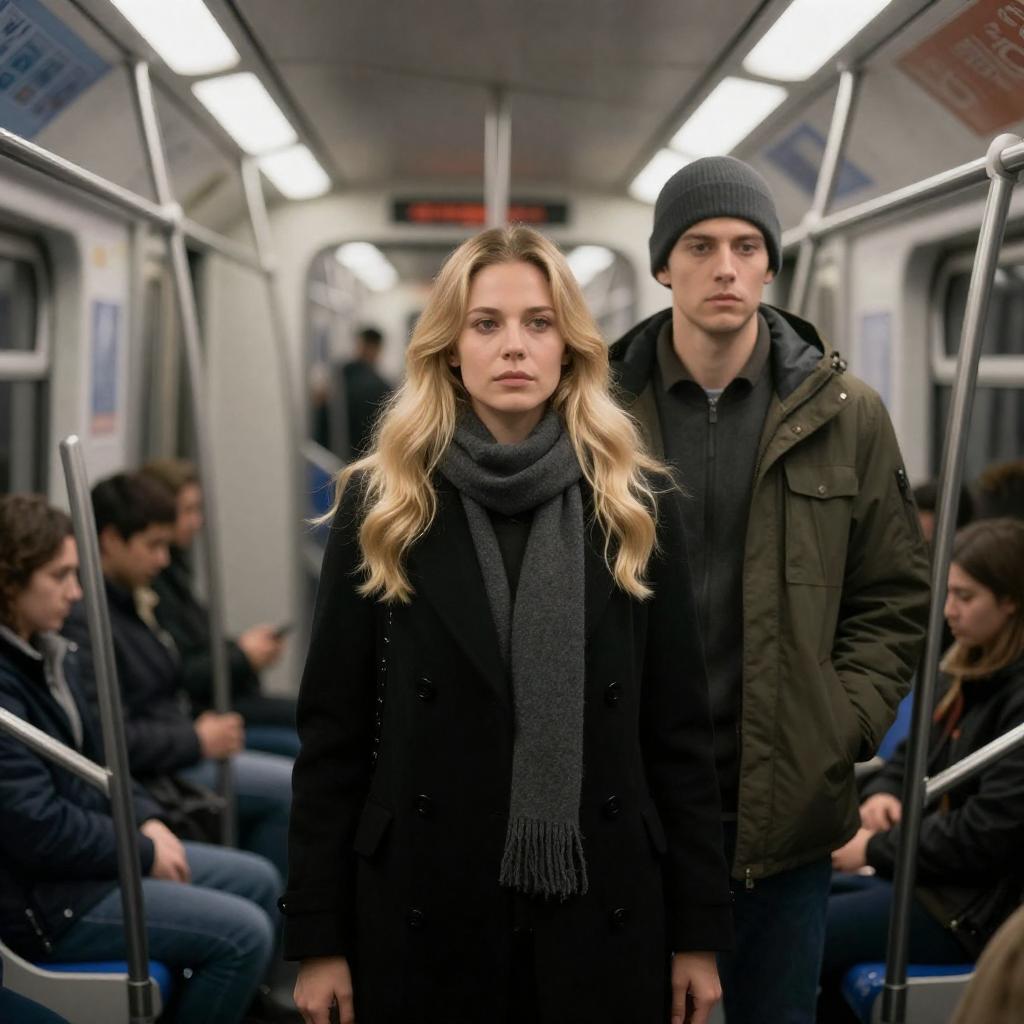 Photograph of a subway car. A blonde woman with long hair, black leather jacket, and scarf stands in the foreground. A bearded man in a green jacket and gray beanie stands behind her. A red-haired child in a gray coat sits to the left. Blue patterned seats and overhead signs in the background. Intense expressions on the man and woman.