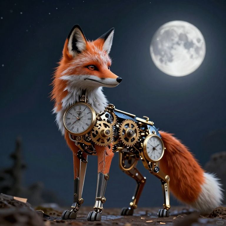 Amidst the celestial dance of moonlight and mechanical whispers, a clockwork fox stands as a poignant symbol of the eternal struggle between the relentless march of time and the enduring spirit of wonder, its gears turning with the weight of forgotten echoes and the promise of untold futures.
