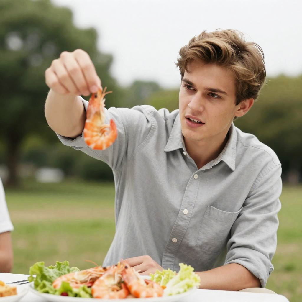 Young man with light brown hair, wearing a gray button-up shirt, sits outdoors on grass. He extends his right arm, holding a piece of cooked shrimp. Shrimp plate with lettuce and other food on table in foreground. Green trees and bright sky in background. Intense facial expression. One visible arm of another person on left.