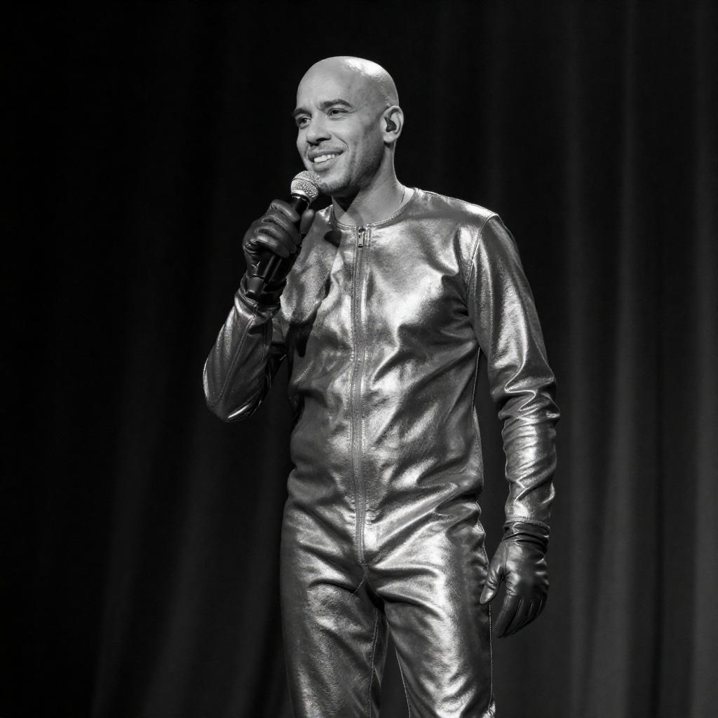 Black-and-white photograph of a male singer in a shiny, metallic jumpsuit and gloves, holding a microphone. He stands confidently on stage, smiling, with a dark curtain background. His outfit reflects light, highlighting its ure. He has a bald head and is positioned slightly to the right.