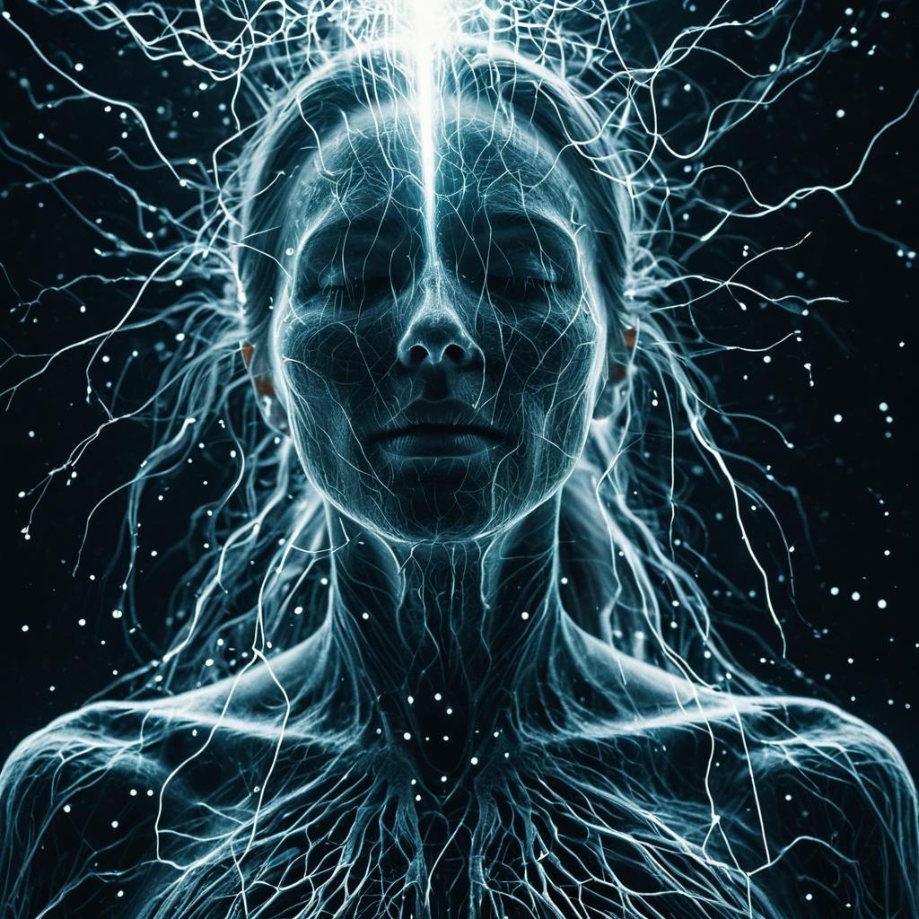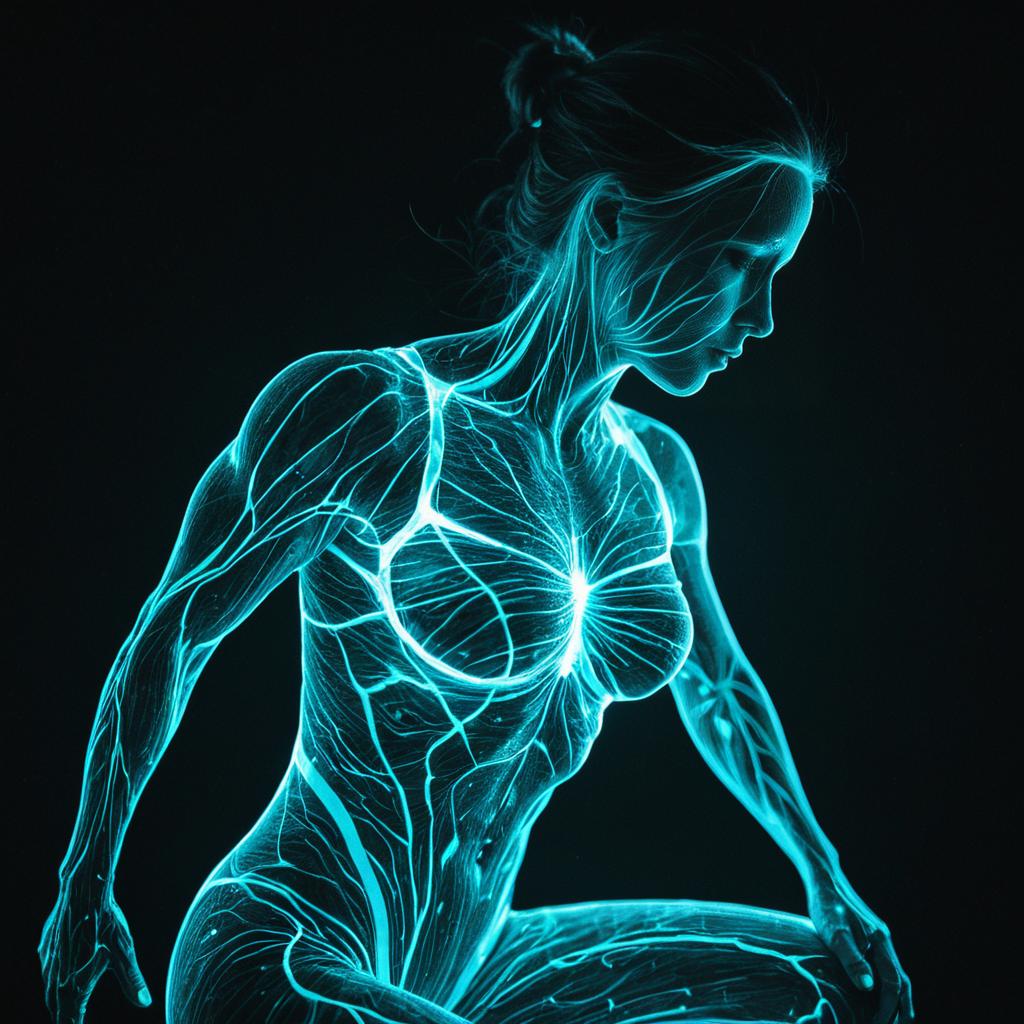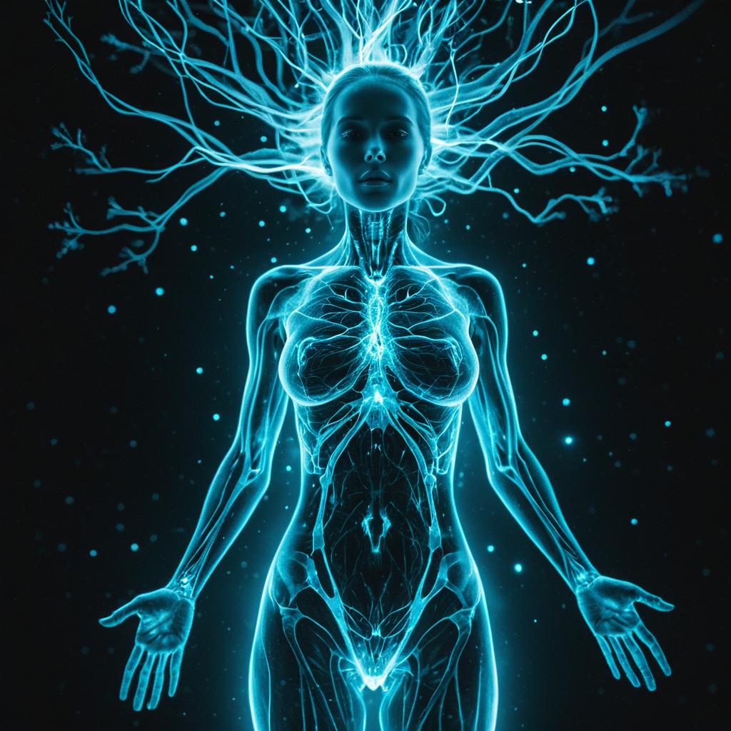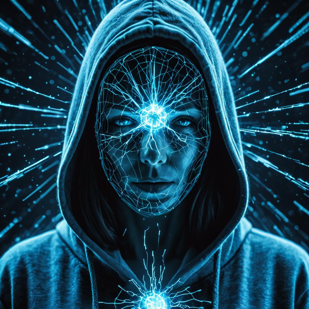 Hooded woman, glowing from within as pulsing glowing core passes through her, at atomic breakdown, radioactive molecules coming apart, fragmented concussive motion blur, deeply translucent azure skin revealing visible cerebrovascular system