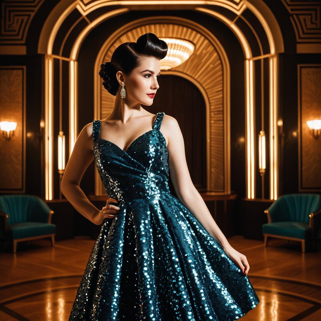 Victory Rolls hairstyle on fashion influencer, wearing sequined cocktail dress, in Art Deco ballroom, captured in fashion editorial style with warm spotlighting.