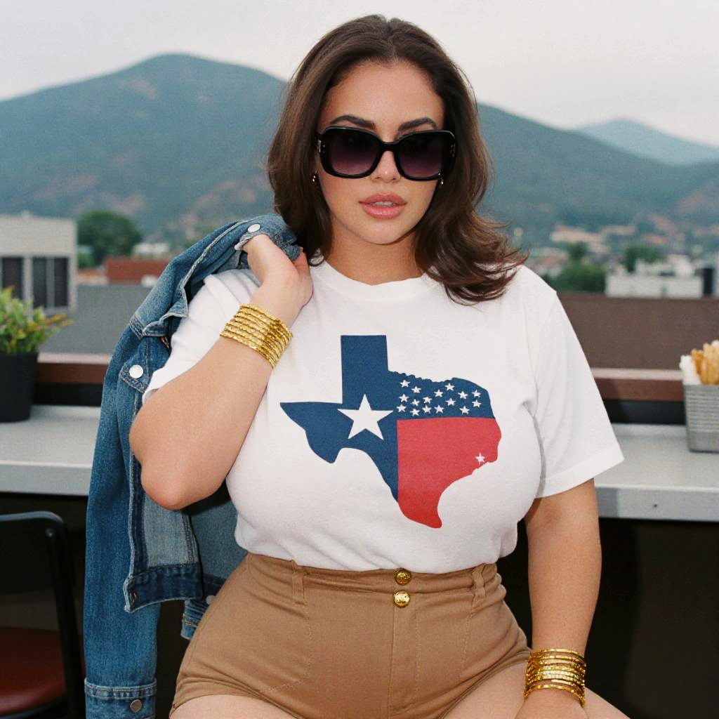 Photograph of a curvy woman with medium brown skin and dark brown hair, styled in loose waves, wearing large black sunglasses. She is dressed in a white t-shirt featuring a graphic of a Texas flag, high-waisted tan pants with gold buttons, and multiple gold bangles on her right wrist. She holds a blue denim jacket over her shoulder. The background shows an outdoor urban setting with mountains and buildings, slightly blurred. The woman sits on a white table with a few potted plants and a pencil holder on the right. The overall style is modern and casual.
