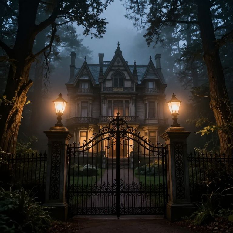 Photograph of a Gothic-style mansion at dusk, shrouded in mist. The dark, ornate house features multiple gabled roofs, tall windows, and intricate stone detailing. A wrought-iron gate with elaborate scrollwork stands in the foreground, flanked by two vintage-style lanterns emitting a warm, yellow glow. Dense trees frame the scene, their branches partially obscuring the sky, which is a deepening blue. The pathway leading to the front door is illuminated by the lanterns, creating a mysterious, inviting atmosphere. The overall composition evokes a sense of eerie elegance and hidden secrets.