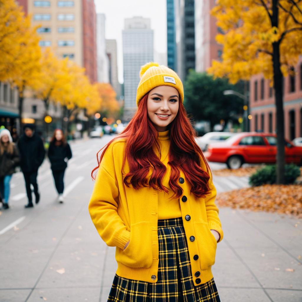 A photorealistic image of a young woman with long red wavy hair standing on an urban street during autumn. She is wearing a yellow beanie, yellow cardigan with black buttons, and a brown and yellow plaid skirt. The background shows blurred city buildings, pedestrians, and autumn trees with yellow leaves. The woman is smiling and dressed casually in soft daytime lighting.
