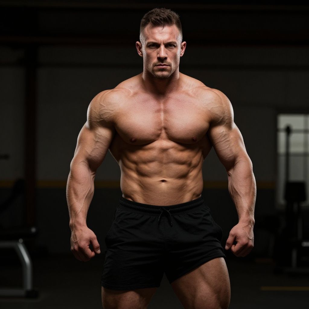 A muscular man stands confidently in an industrial setting, showcasing his impressive physique. The dramatic lighting accentuates his defined muscles, creating a powerful and inspiring atmosphere, perfect for fitness and bodybuilding themes.