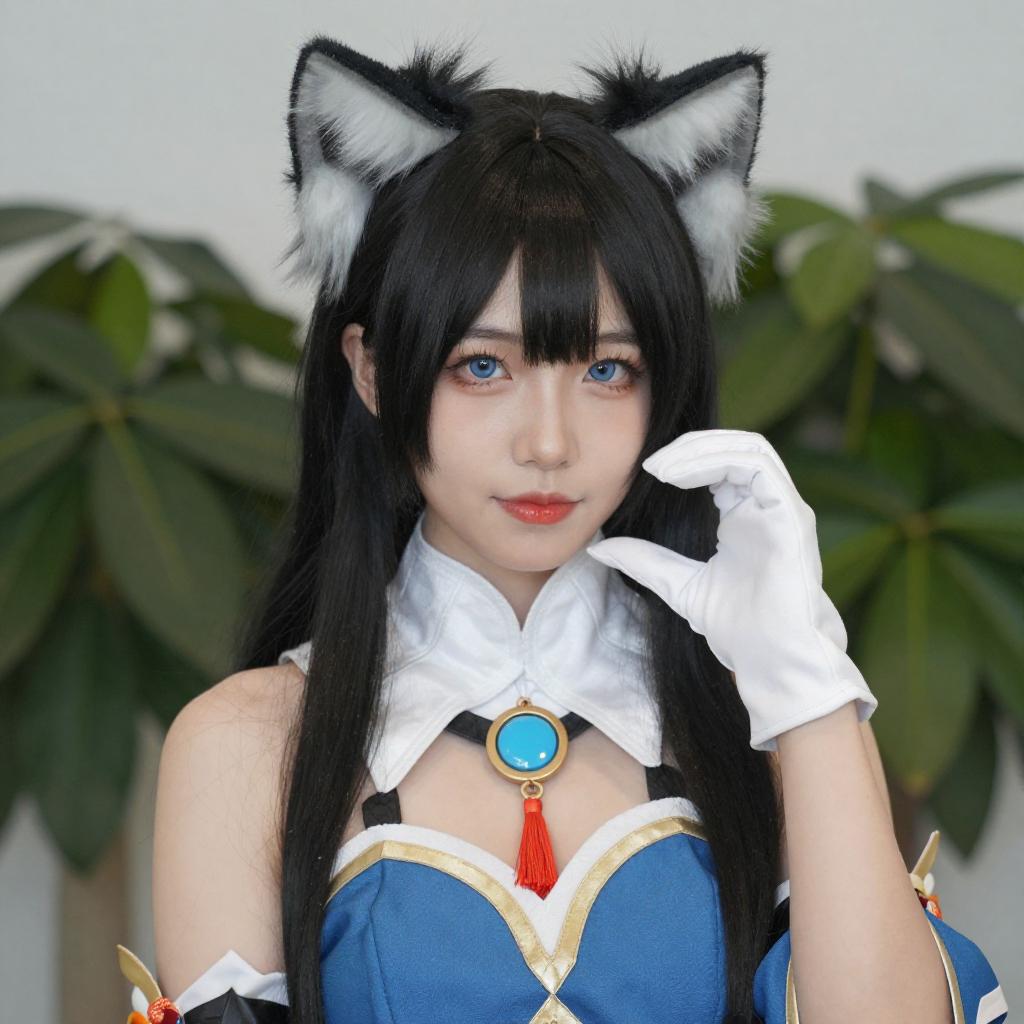 Photograph of an Asian woman cosplaying as a fox character. She has black hair with bangs, wears a white fox mask with red and gold accents, and a red and gold off-shoulder top with a hexagonal emblem. She makes a peace sign near her face, smiling slightly. A small red heart tattoo is visible on her right shoulder. Background is blurred.