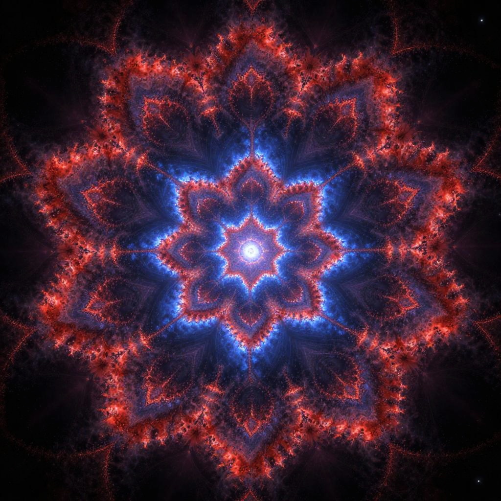 Free fractal generator crafting vibrant, layered fractal designs with complex repeating motifs, blending fiery reds and electric blues, featuring glowing outlines and soft mist effects, presented against a deep space backdrop highlighting infinite structure.