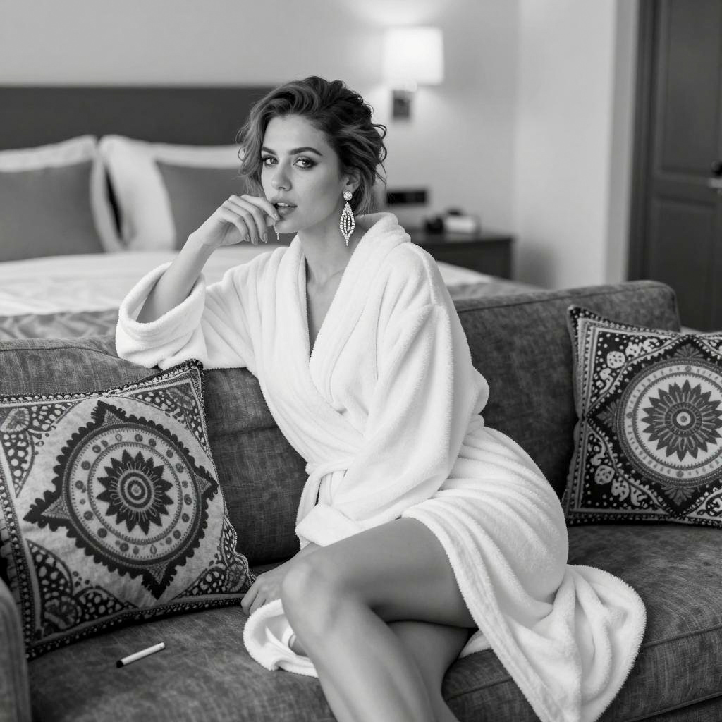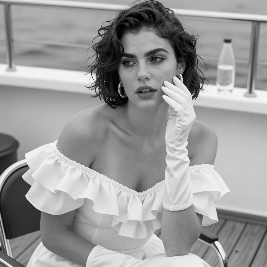 Black and white photograph of a woman with light skin and dark hair in an elegant, strapless, ruffled dress. She sits barefoot on a chair, legs crossed, right hand on knee, left arm resting on chair. Wooden ceiling with hanging lamp in background. She wears large earrings and has a confident expression.