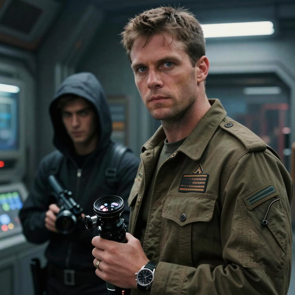 Realistic photo.sharp, highly detailed, film from a 1990s action 8k movie, a lone hero infiltrating a high-tech facility, a tough ex-soldier and a clever hacker, wearing correct era clothes, atmospheric lighting, in focus, reflective eyes, 35mm macro lens, live action, nice composition realistic photo
